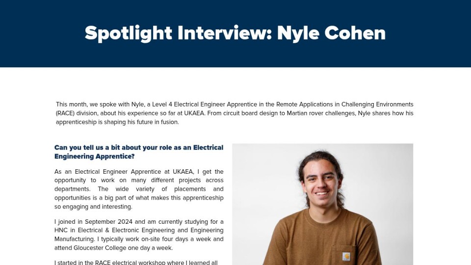 This month, we spoke with Nyle, a Level 4 Electrical Engineer Apprentice in the Remote Applications in Challenging Environments (RACE) division, about his experience so far at UKAEA. From circuit board design to Martian rover challenges, Nyle shares how his apprenticeship is shaping his future in fusion.
